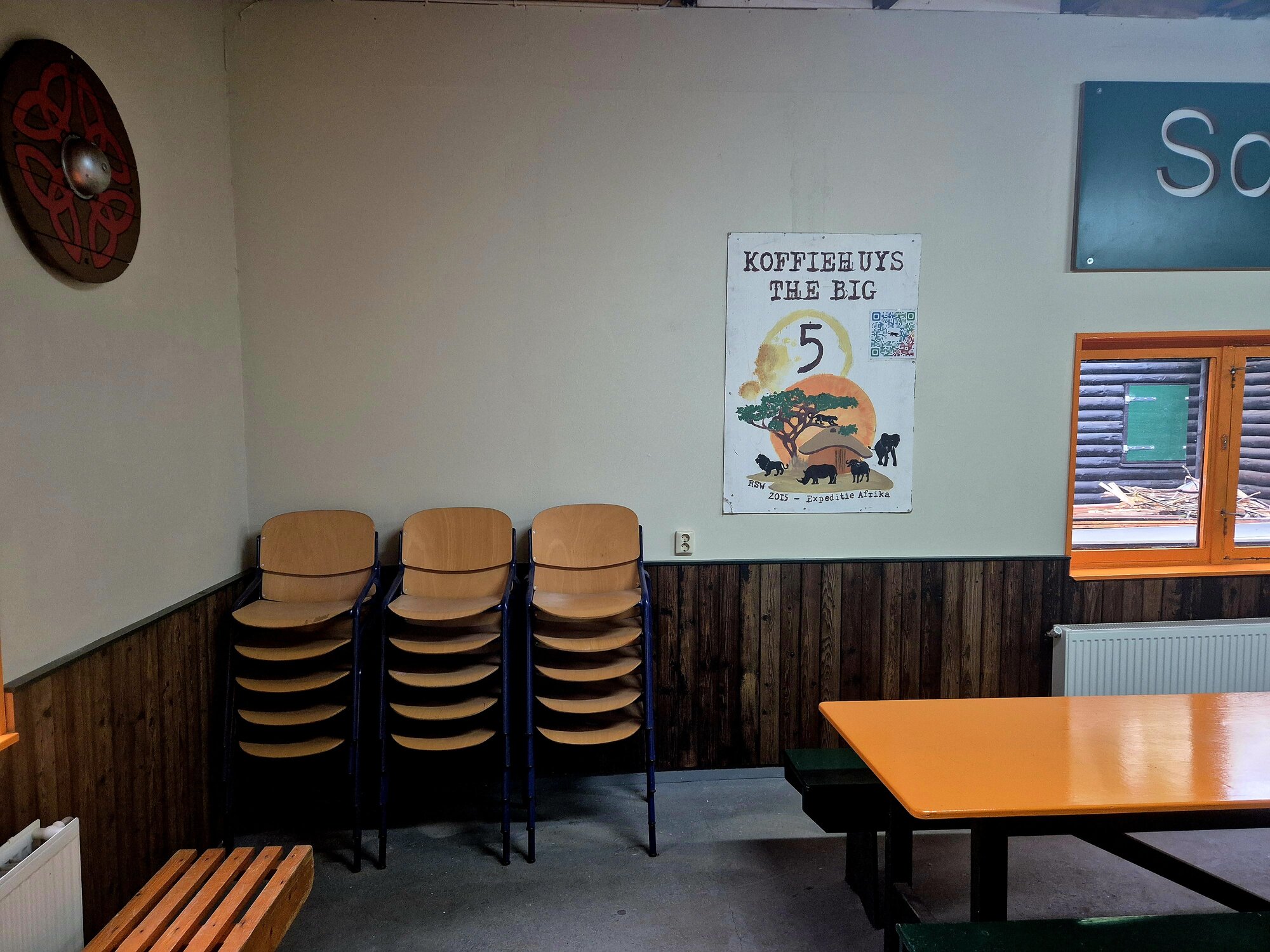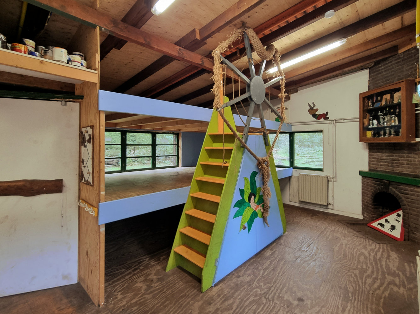 Op de drie slaapplatforms boven elkaar, is ruimte voor ongeveer 20 jeugdleden.