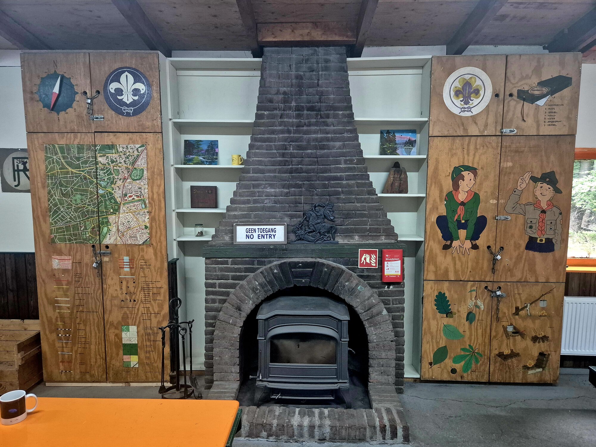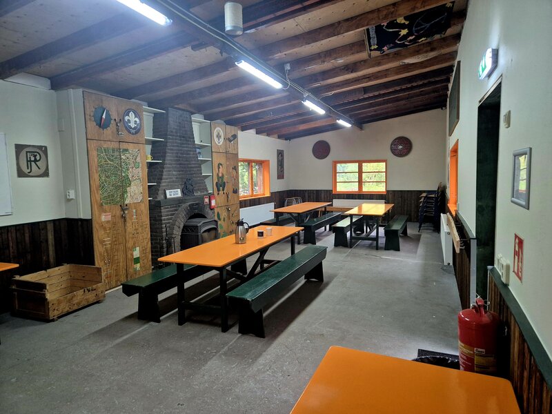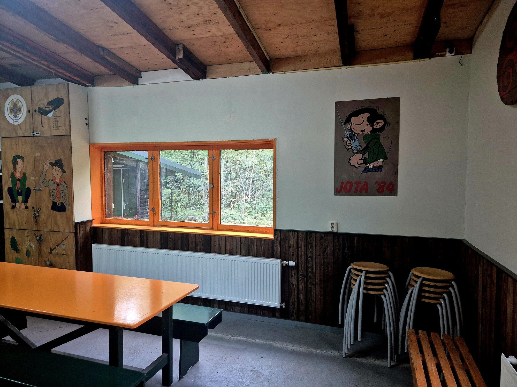 Scouts slapen in hun slaapzak op een matje. Onze slaapzaal heeft daarom alleen slaapplatforms, waar je je eigen slaapspullen kunt neerleggen. Zo slaap je het lekkerste: in je eigen slaapzak. Natuurlijk kan er een raampje open voor genoeg frisse lucht. En zodat je de zwijnen de schuld kan geven van gesnurk :)